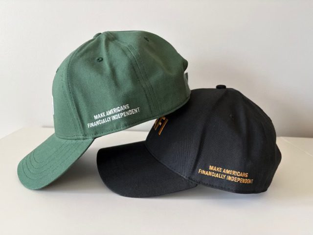 A stylish green cap with ‘MAFI’ embroidered on the front, and “MAKE AMERICANS FINANCIALLY INDEPENDENT” on the side. An adjustable velcro band is in the back of the hat. Elevate your style with MAFI baseball caps! Perfect for any occasion, these trendy hats offer comfort and flair. Get yours today and make a statement!